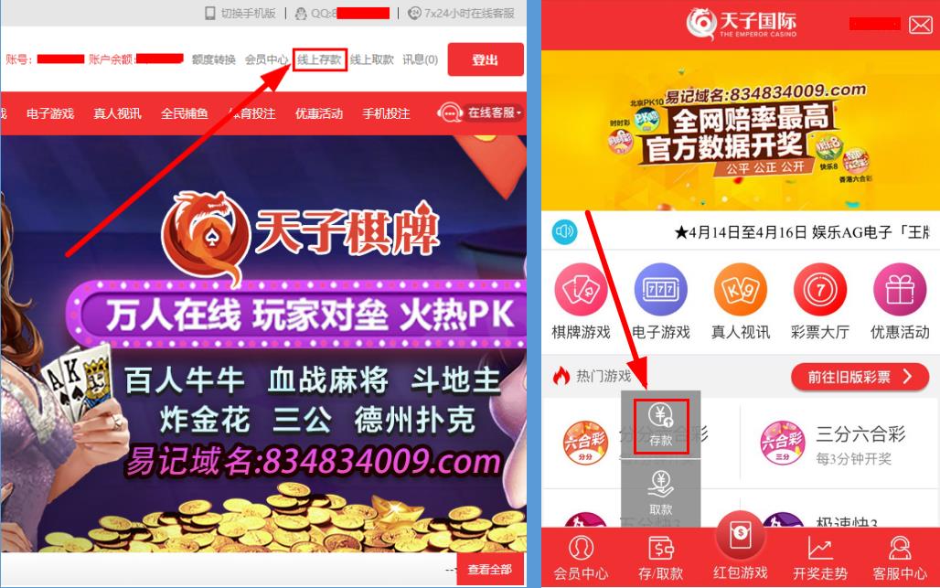 电脑用户:进入天子国际官网,登入会员账号后,点击线上存款。